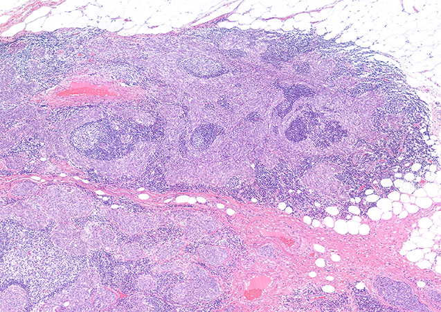 A 76-year-old woman presented to the emergency department with acute chest pain associated with hypertensive crisis and flushing. A thoracic computed tomography (CT) scan revealed a 22-mm nodule in the anterior mediastinum. The lesion was surgically excised shortly thereafter. On gross examination, the specimen consisted of a well-circumscribed, solid-cystic whitish lesion. Histopathological findings on hematoxylin and eosin staining are shown in Figures 1 and 2. Immunohistochemical results are presented in Figure 3 (p40), Figure 4 (CD5), Figure 5 (c-KIT), and Figure 6 (TdT). Neoplastic cells were negative for neuroendocrine markers, PAX8, and Epstein-Barr virus (EBV).