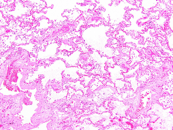 This case depicts an example of diffuse alveolar septal amyloidosis, characterized by the abnormal deposition of amyloid within alveolar septa and vessel walls. It occurs most frequently in patients with known systemic amyloidosis, but can rarely occur in patients without a prior history of extrapulmonary disease. On routine histologic sections, lung architecture is preserved with the characteristic appearance of variably thickened alveolar septa, with some areas being almost normal and others being expanded by amyloid deposits, including amyloid deposition within vessel walls. Amyloid can be differentiated from collagen deposition (interstitial fibrosis) since the former has an amorphous appearance. Involvement of blood vessels in amyloidosis is another clue to the diagnosis. Lastly, amyloid deposits are congophilic with apple-green birefringence under polarized light, which confirms the diagnosis. Immunostains to subtype the amyloid protein can be attempted, but are very difficult to interpret because of high background. Currently, mass spectometry is considered the most accurate method to subtype amyloid.