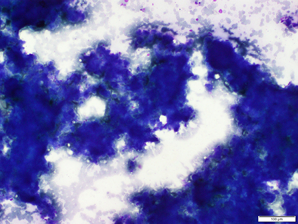 Mediastinal lymph node involvement in systemic amyloidosis is rare. EBUS-TBNA may be an alternative to surgical biopsies for the diagnosis of lymph node involvement by amyloidosis. Cytologically, amyloid appears as amorphous congophilic material (Figure 2) (purple on Giemsa [Figure 1] and light green on Papanicolaou stains).