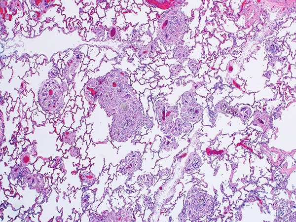 Embolization of filler particles to the lung elicits a foreign-body granulomatous reaction in the perivascular interstitium. In addition, arterial changes of mild to moderate pulmonary hypertension may be seen, although not all patients develop pulmonary hypertension clinically.