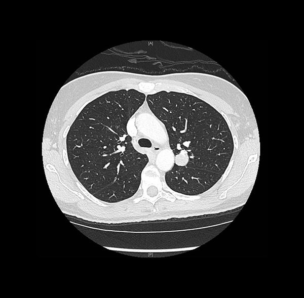 Clinical History: A 47-year-old woman, former smoker, was found to have an incidental lung nodule during the workup of an appendiceal adenocarcinoma ex-goblet cell carcinoid. The chest CT showed a round, well-circumscribed solid nodule in the posterior left upper lobe abutting the major fissure, measuring 2.0 cm (Figure 1). A trans-thoracic core needle biopsy was performed (Figures 2-6; Fig 3: pancytokeratin, Fig 4: epithelial membrane antigen, Fig 5: TTF-1, Fig 6: napsin A).
