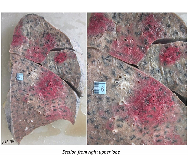 Clinical History:A 40-year-old post-menopausal woman presented with intermittent fever, chills, body ache, easy fatigability, and generalized weakness for two months. She was found to have pancytopenia with a few atypical cells (myeloblast morphology). The patient worsened clinically and expired within two days of admission. At autopsy, blasts were seen within the bone marrow, liver and spleen. The gross morphology of the right lung and sections from the right upper lobe are shown in Figures 1-6.