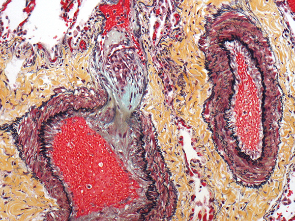 In the current case, Figures 1-8 illustrate medial hypertrophy of muscular arteries with intimal fibrosis, luminal narrowing, muscularization of arterioles, and multiple plexiform and dilatation lesions. These findings, highlighted by Movat pentachrome stains (Figures 1,6, and 7), are diagnostic of severe pulmonary hypertension.