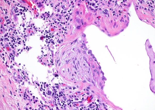 Usual interstitial pneumonia (UIP) is a fibrosing interstitial pneumonia and is one of the more common interstitial lung disease diagnoses made by the surgical pathologist. It is an important diagnosis not to miss and also not to overcall as it has important clinical consequences (treatment with anti-fibrotics and possible lung transplantation after disease progression). UIP is the pathologic correlate to the clinical term idiopathic pulmonary fibrosis (IPF) and as its clinical moniker implies the cause of UIP/IPF is unknown. It is hypothesized that there is some form of ongoing damage occurring within the lungs to incite a fibrotic response. The fibrosis is more prominent peripherally and in the lower lobes. Histologic features required for diagnosis include temporal and spatial heterogeneity, fibroblastic foci, and honeycombing. Fibroblastic foci are located within the interstitium and most commonly at the border of the advancing fibrosis. They are composed of a proliferation of fibroblasts and their nuclei are usually arranged parallel to the interstitium. They form small outpouchings within the interstitium and can be appreciated on low power by their myxoid appearance (Figure 1). They should be distinguished from fibroblastic plugs which are seen in organizing pneumonia. Fibroblastic plugs look similar but are located within airspaces and not in the interstitium. While fibroblastic foci should be present in order to diagnose UIP (with rare exceptions), it is important to note that they are not specific for UIP and can be seen in other interstitial lung diseases. Honeycombing is another key feature for the diagnosis of UIP. It consists of architecturally distorted airways surrounded by fibrosis and often with inspissated secretions (Figures 2 and 3). In UIP, honeycombing is typically most prominent in the lower lobes and at the bases and less so in the upper lobes. UIP shows a distinctive appearance on lower power of normal-appearing lung juxtaposed with severely fibrotic lung (Figure 4). The fibrotic areas are often most extensive in subpleural parenchyma and along interlobular septa, leaving a donut of normal-appearing lung in the center (“spatial heterogeneity”) (Figures 5 and 6). Temporal heterogeneity refers to differing ages of fibrosis as well as the uninvolved lung as compared to heavily involved lung. A mild chronic inflammatory component is often seen in UIP but if the inflammation is severe and widespread other diagnoses should be considered.