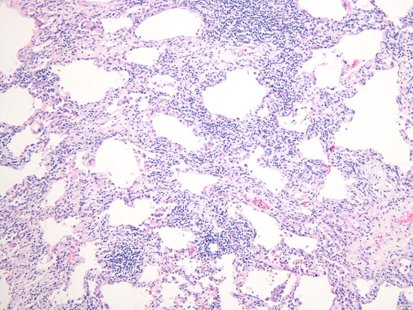 NSIP can be categorized as either cellular, fibrotic, or as a mixed cellular and fibrotic pattern. Cellular NSIP is characterized by interstitial lymphocytic and plasma cell infiltrates without significant fibrosis. Variable degrees of fibrosis can be present in fibrotic NSIP, which can be subclassified as mixed cellular and fibrotic or fibrotic NSIP depending on the degree of fibrosis. A uniform pattern of interstitial inflammation, as seen in this case, is characteristic for cellular NSIP (Figures 1 and 2). Fibrotic NSIP also shows a uniform pattern of distribution of fibrosis as opposed to the patchwork of fibrosis seen in UIP. Moreover, fibrotic NSIP shows temporally uniform chronic fibrosis with collagen deposition, in contrast to the temporal heterogeneity of fibrosis in UIP characterized by chronic fibrosis juxtaposed with more active fibrosis as shown by fibroblast foci. Lymphoid follicles with prominent germinal centers around bronchioles are diagnostic for follicular bronchiolitis (Figures 3 and 6), which tend to result in obstructive pulmonary function abnormalities, likely due to compression of the bronchiolar lumens by enlarged lymphoid follicles.