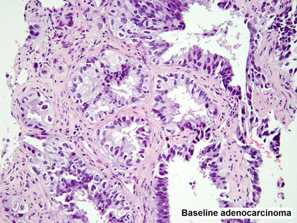 The morphology of small cell carcinoma in acquired resistance samples is identical to that of de novo small cell carcinoma. It is characterized by densely packed sheets of small tumor cells with finely granular chromatin and absent to inconspicuous nucleoli. Nuclear molding, necrosis, and a high mitotic index are typical features. The diagnosis can be supported by labeling for neuroendocrine markers (chromogranin A, synaptophysin, CD56, and the recent marker INSM1). TTF-1 is positive in over 90% of cases. The Ki-67 (MIB-1) labeling index is high (50-100%). Small cell histology is not found in pre-treatment samples, which show conventional adenocarcinoma morphology (as seen in Figure 1).