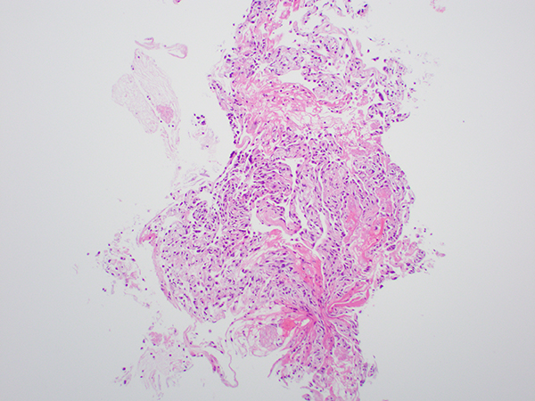 Clinical History: A 35-year-old man with a history of smoking and HIV infection presents with dry cough, fever with sweats, and difficulty in breathing for several days. Clinical examination reveals an increased respiratory rate, tachycardia, and fine crackles on auscultation of the chest. Chest radiograph shows diffuse bilateral infiltrates and subsequent high resolution computed tomography shows multiple ground glass opacities in the lung. Bronchoalveolar lavage (BAL) and transbronchial biopsy (Figure 1-3) are performed. Tissue is also sent for bacterial, fungal and mycobacterial cultures