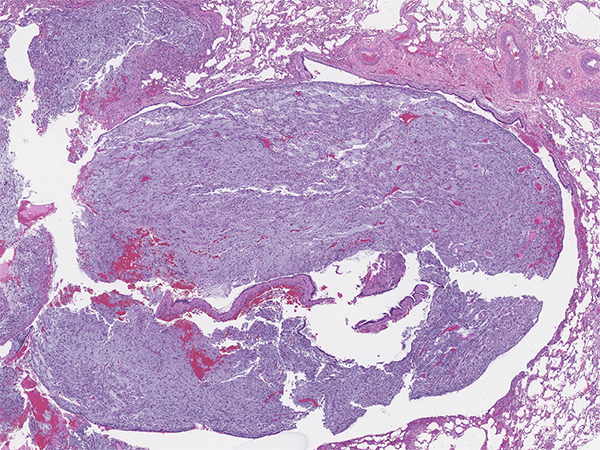 Inflammatory myofibroblastic tumor (IMT) is a mesenchymal neoplasm of intermediate biological potential composed of myofibroblastic cells associated with variable inflammatory infiltrate of plasma cells, lymphocytes and eosinophils. This tumor was given numerous names in the past, notably plasma cell granuloma and inflammatory pseudotumor. IMT can occur at any anatomic site, and comprises less than 1% of all lung tumors. It usually presents as a peripheral lung lesion, but in about 10-20% of cases can be endobronchial. Approximately half of patients with IMT are symptomatic. Local symptoms may be secondary to local growth and obstruction of the airways. Systemic symptoms are variable and include fever, night sweats, weight loss, accompanied by laboratory findings of anemia, elevated erythrocyte sedimentation rate and thrombocytosis. IMT has potential for local recurrence and rarely metastases.