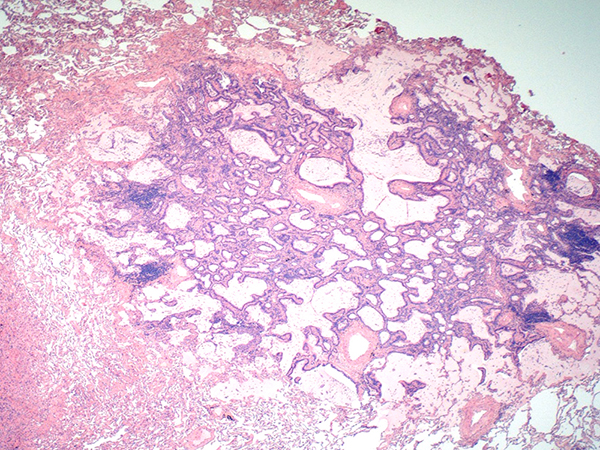 Clinical History: A 75 year old female with a history of a previously resected right upper lobe pulmonary adenocarcinoma presented with two nodules in the left upper lobe 14 years later. The patient underwent a left upper lobe wedge resection encompassing both radiographic nodules. Grossly, distinct 10.0 mm and 4.0 mm nodules were identified. The larger nodule was a classical non-mucinous acinar predominant adenocarcinoma; however, the smaller nodule had a different appearance, as illustrated in Figures 1-6.