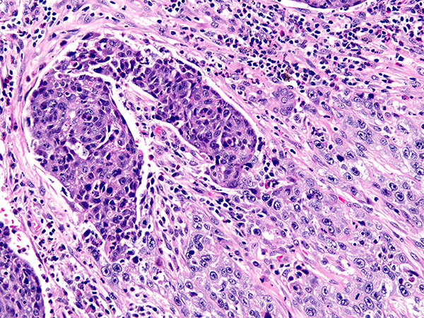 Both p63 and p40 can be used as squamous markers in the subtyping of non-small cell lung carcinomas that cannot be subtyped on H&E, especially when staining is strong and diffuse. Both markers have equivalent sensitivity for squamous cell carcinoma, being positive in essentially all poorly differentiated squamous cell carcinomas of the lung. In terms of specificity, p40 is superior to p63, in that it stains a lower proportion of adenocarcinomas (3% vs. 31%). Even with this increased specificity, rare cases of lung adenocarcinoma can stain focally with p40. Neither p63 nor p40 have a role in determining site of origin of squamous cell carcinoma.