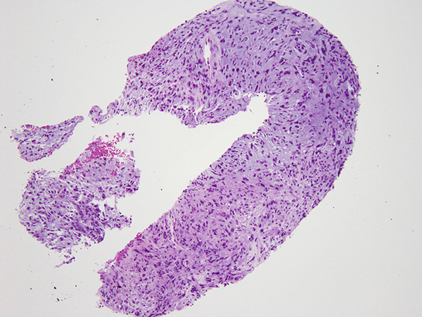Clinical History: An 82-year-old woman was found to have a 1.4 cm perihilar nodule in the right upper lobe (Figure 1) on a surveillance CT four years after a lobectomy for a lung adenocarcinoma. Prior history also includes a remote diagnosis of a poorly differentiated breast invasive ductal carcinoma, status post left mastectomy, adjuvant chemotherapy, radiation and Tamoxifen. The nodule was sampled by a core biopsy (Figures 2-5). The tumor was positive only for vimentin (Figure 6) but negative for pan-cytokeratin and multiple other markers including vascular markers (CD31, CD34, ERG), myoepithelial markers (S100, SOX10, p63, SMA), CD117, STAT6, and ALK. Subsequently, next generation sequencing detected an EWSR1-CREB1 translocation.