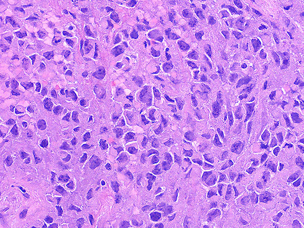 These tumors have a characteristic appearance with discohesive high-grade round cells and focal rhabdoid cells with eosinophilic inclusions that indent the eccentrically located nuclei (Figures 3-5). These tumors typically have a more monomorphic appearance but have prominent nucleoli, abundant mitotic activity and necrosis. Expression of the cell adhesion molecule Claudin-4 and the SMARCA2 protein (another major catalytic subunit of SWI/SNF complexes) is also typically lost in these tumors.