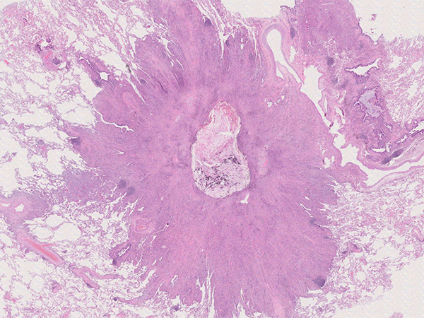 Clinical History: A 1.8-cm solitary peripheral pulmonary nodule was resected in a 72-year-old woman with long-standing rheumatoid arthritis. The clinical suspicion was carcinoma or a rheumatoid nodule. Macroscopically, the nodule was tan-white and lobulated, with central necrosis and calcification as seen in Figure 1. Histologically, the nodule consisted predominantly of cytologically bland histiocytes and multinucleated giant cells with cytoplasmic inclusions and some background fibrosis (Figure 2). The histiocytes were positive for CD163 (Figure 3). The cytoplasmic inclusions were visible as unstained rhomboid/needle-shaped cytoplasmic inclusions in the CD163 stain (Figure 3) and accentuated in the Gram stain (Figure 4).