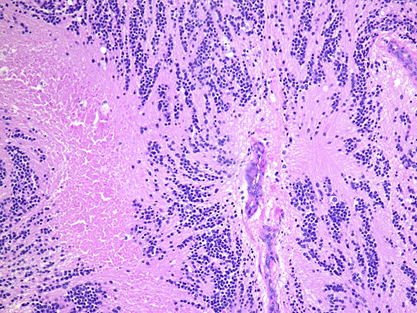 Fig 3. Small blue cells amidst neuropil-rich stroma and foci with comedo-like necrosis (100x)