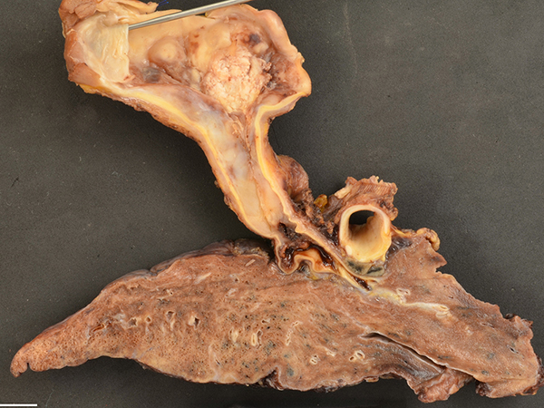 These tumors can occur in patients across a large age range and often present with dyspnea and findings in keeping with chronic thromboembolic disease that is resistant to treatment with anticoagulation. Some studies suggest that incidental pulmonary artery sarcomas can be identified in 1-4% of thromboendarterectomy specimens from patients with chronic thromboembolic disease. As in this case, there may be areas of hemorrhagic infarction downstream from the main lesion (Figure 6).