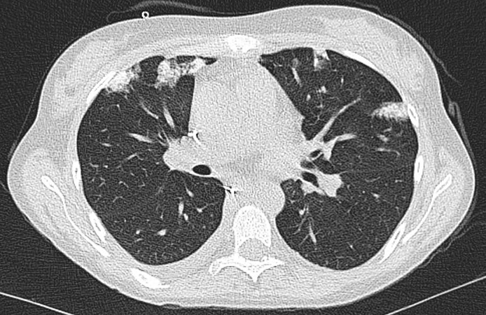 Clinical History: A 21-year-old asymptomatic woman developed pulmonary lesions in the setting of recent liver transplantation. The opacities were discovered on abdomino-pelvic CT performed for nausea 2 months post transplantation. The patient’s initial liver transplantion was at the age of 1 for biliary atresia, but she required re-transplantation 20 years later for cirrhosis, and then most recently a 3rd transplant due to thrombosis of the inferior vena cava and splenic vein. She remained in hospital for several weeks following the most recent transplant. She did not smoke tobacco but did smoke marijuana twice a week, and occasionally drank alcohol.