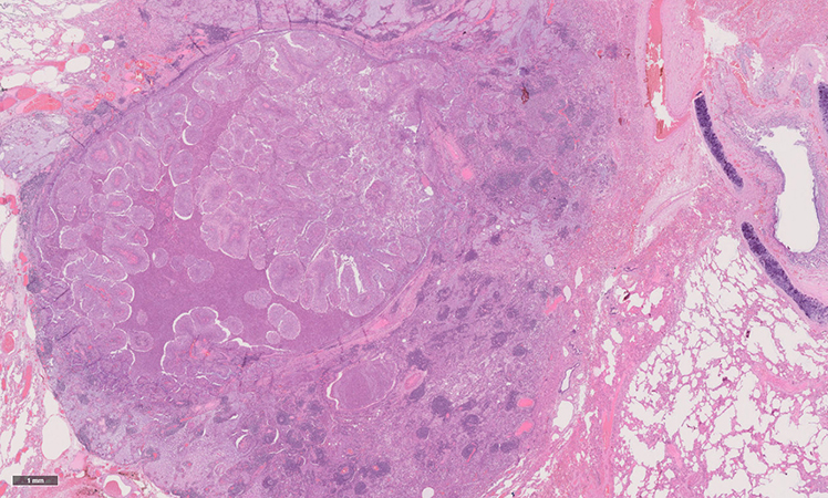 Clinical History: A PET-positive 1.5-cm solitary central pulmonary nodule was resected in a 67 year-old woman (non-smoker). The clinical suspicion was malignancy. Macroscopically, the nodule was tan-white and well demarcated. As depicted in Figure 1 (H&E) and Figure 2 (EvG), histologically the nodule was predominantly endobronchial with minimal alveolar extension and consisted of a papillary tumor. There was an acute inflammatory infiltrate between the fibrovascular cores. The surrounding lung parenchyma showed mucostasis and lympho-follicular inflammation, which could be attributed to a post-obstructive complication. The fibrovascular cores were lined by glandular epithelium with pseudostratified ciliated and non-ciliated cuboidal to columnar mucin-filled cells (Figure 3) and interspersed areas of acanthotic squamous epithelium (Figure 4, H&E; Figure 5, p40). There was no atypia, karyorrhexis or necrosis.