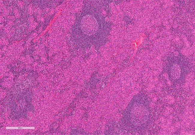 Micronodular thymoma with lymphoid stroma (MNTLS) is rare, first described in 1999 as an unusual morphologic variant of spindle cell thymoma showing a marked hyperplastic response of the normal thymic B-cell compartment.