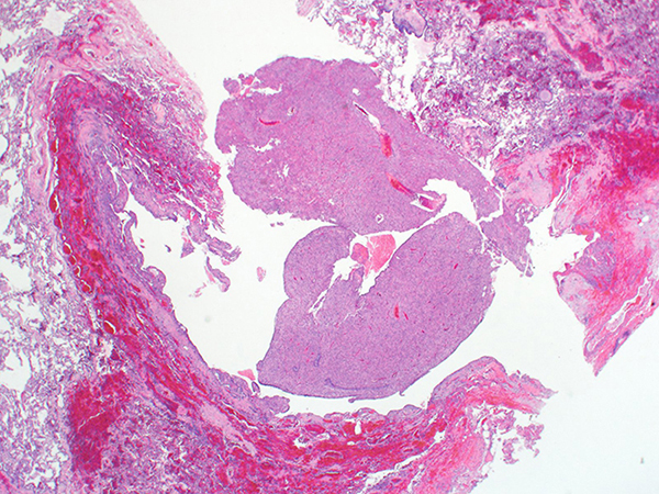 Clinical History: A 50-year-old woman with minimal remote history of smoking was found to have a 1.5 cm mildly PET avid nodule in the right lower lobe without lymphadenopathy. She underwent right lower lobe wedge resection. H&E photomicrographs of the nodule are shown in Figures 1-4 and an immunohistochemical stain for HMB-45 in Figure 5. The neoplastic cells were negative for cytokeratin AE1/AE3, S100, CD68, and SMA.