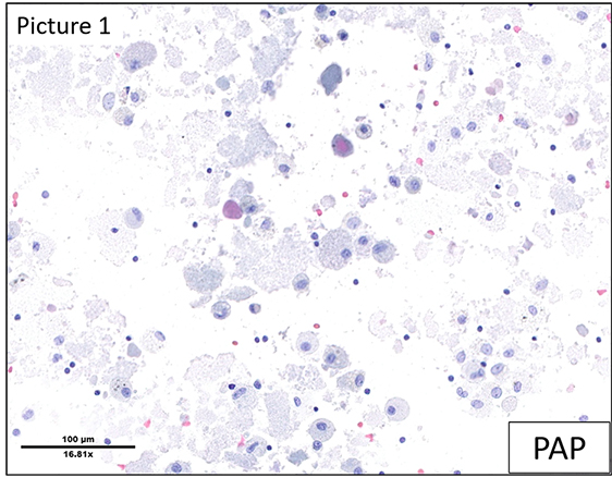The H&E slide from the lung (Figure 4) shows the presence of finely granular proteinaceous material filling the alveoli (also PAS positive). There is no significant associated inflammation and there are no atypical cells.