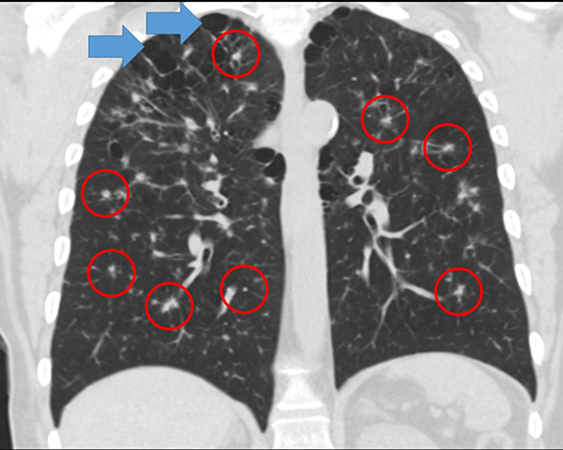 The usual chest x-ray findings are diffuse bilateral reticulonodular infiltrates with normal or increased lung volumes. Chest CT findings include bilateral lung nodules that are often centrilobular, cavitary and are almost invariably tiny (millimeter-sized). They may be so numerous as to raise the possibility of disseminated mycobacterial or fungal infection or disseminated malignancy on imaging. This differential diagnosis often prompts a lung biopsy. Bilateral thin-walled cysts may also occur. These are usually - but not always - bilateral and upper and mid-lung predominant. Relative sparing of lung bases is often cited in the imaging literature. Bilateral ground-glass opacities, probably attributable to macrophages and/or smoking-related interstitial fibrosis (SRIF). Theoretically, the combination of nodules and cysts might be so characteristic that the diagnosis can be made on the basis of chest CT alone and biopsy can be avoided. In practice, although radiologists often suggest the diagnosis in classic cases, most cases are biopsied for confirmation. Pathology is the gold standard for this diagnosis.