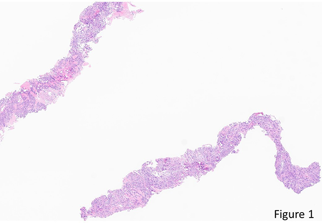 Clinical History: A 70-year-old man with an apparently isolated lower lobe lung mass underwent CT-guided core needle biopsy. On H&E sections (Figure 1: 40x, Figure 2: 200x, Figure 3: 400x) there are up to 4 mitotic figures per 3 high-power fields. The neoplasm has patchy reactivity with antibodies directed against EMA (Figure 4) and progesterone receptor (Figure 5), and diffuse strong reactivity with antibodies directed against SSTR2A (Figure 6). There is no reactivity with antibodies directed against AE1/AE3, TTF-1, napsin A, p40, synaptophysin, SOX10, S100, STAT6 or CD34.