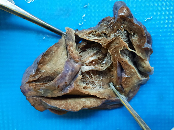 Clinical History: A 1 year old female presented with increasing respiratory distress and hemoptysis. The baby was born full term in an uncomplicated vaginal delivery. A CT scan demonstrated a 6.8 x 5.5 x 4.4 cm cystic lesion in right lower lobe. A right lower lobe lobectomy was completed, and grossly multiple cysts, measuring up to 7x5x5 cm (Fig 1) were identified. No nodules, masses or pleural thickening are seen. Histologic sections show multiple irregularly shaped cysts with branching papillae and lined by pseudostratified columnar epithelium. (Fig 2). The wall of the cyst shows bundles of smooth muscle fibers scattered mononuclear cells (lymphocytes and few plasma cells) and few lymphoid aggregates. (Fig 3, 4) The adjacent lung parenchyma shows focal areas of collapse (Fig 6) and emphysematous changes. (Fig 5). No mucinous cell proliferations or clusters are identified. There is no evidence of blastemal component or dysplasia or malignancy. No abnormal systemic arterial supply was identified.