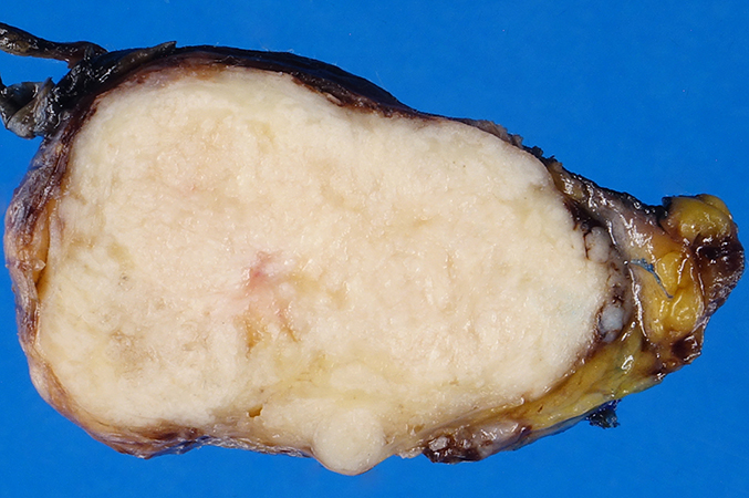 The gross specimen revealed a 5.0 x 4.5 x 3.5 cm encapsulated, firm-to-rubbery mass. On cut section, the tumor appeared tan-white and homogenous with a well-circumscribed border (Figure 1). Histologic sections (Figures 2-5) revealed a biphasic tumor consisting of anastomosing nests and trabeculae of epithelioid cells abruptly juxtaposed with the ramifying bands of plump, fibroblast-like spindle cells with tapered nuclei and indistinct borders. The epithelioid cells were variably sized polygonal cells with moderate eosinophilic cytoplasm and slightly enlarged, irregular nuclei with granular chromatin, small nucleoli, and occasional nuclear grooves. No mitoses or areas necrosis were seen. Only rare intratumoral lymphocytes were identified, all of which were Tdt negative. Cells of the epithelioid component were diffusely positive for p40 and pancytokeratin (AE1/AE3), while the spindle cell component was negative for both markers (Figure 6).