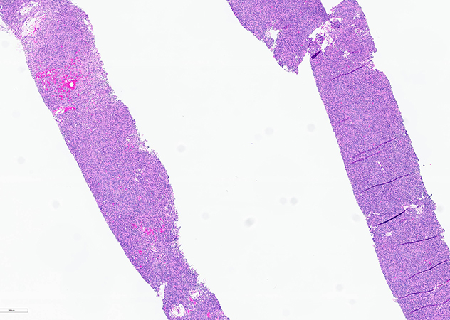 Clinical History: A 65-year-old male with a 10.5 pack-year smoking history (daily smoker) underwent a routine screening CT scan of the chest which showed a 10 cm mass in the right middle lobe of the lung. A CT-guided biopsy was performed (figures 1-3 H&E, 4-8 immunohistochemical stains) which showed a low-grade spindle cell neoplasm (figures 1-3). On immunohistochemistry, the spindle cells demonstrated immunoreactivity to AE1/AE3, p40, and CD20; a stain for TdT highlights the paucity of T cells (Figures 4-8). Also included in the workup were stains for S100, INSM1, STAT6, CD34, TTF-1, Napsin-A, PAX-8, Desmin, SMA, CD21, and SS18-SSX, which were all negative. Additional imaging and PET scan indicated that this mass was lobulated, heterogeneous, and partially calcified in the anteromedial middle lobe, abutting the pericardial surface and anterior pleura, further extending into the mediastinum. Whether this mass was primarily originating in the mediastinum and involving the lung or arising in the lung and extending into the mediastinal region was not clear at the time of the biopsy. Genomic DNA extracted from this tumor was analyzed using next-generation sequencing (NGS), which showed only KDM6A mutations.