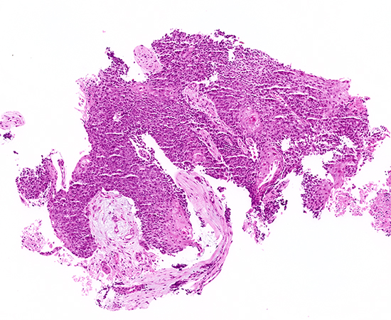 Clinical History:A man in his early 20s presented with progressive dyspnea and a cough producing mucus and tissue fragments. He is a non-smoker but has a history of occasional vaping. Imaging revealed a midline thoracic mass abutting the central airways with extensive mediastinal lymphadenopathy. A bronchoscopic biopsy was performed. The biopsy demonstrated sheets of tumor cells infiltrating a desmoplastic stroma (Figure 1, 4×). The neoplastic cells appeared relatively monotonous with focal keratinization (Figure 2, 10×; Figure 3, 20×). Notably, there were areas of abrupt squamous differentiation with keratin "pearls" (Figures 4 and 5, 20×). By immunohistochemistry, the tumor cells were diffusely positive for p40 and negative for TTF-1, and no intracytoplasmic mucin was identified on special stains. Given the patient's age and the unusual presentation, additional studies were performed: a NUT antibody immunostain showed speckled nuclear positivity, and molecular testing confirmed a BRD4::NUTM1 gene fusion, establishing the diagnosis.