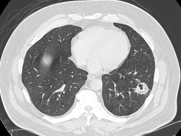 Clinical History: A man in his 50s being treated for bilateral angiomyolipomas with everolimus underwent a routine follow-up abdominal CT, which revealed a lung lesion. A dedicated chest CT confirmed the presence of a 2.5-cm cavitary nodule in the lower lobe of the left lung (Figure 1). The lesion was hypermetabolic (SUV 2.5). He was a current smoker (>40 pack years). There was no other significant history.
