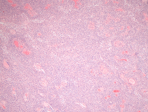 Lymphoepithelial carcinoma is characterized by syncytial growth of carcinoma cells with lymphoplasmacytic infiltrates, although in rare cases the lymphoplasmacytic infiltration is minimal. Focal keratinization has also been reported, and rarely amyloid deposition within the tumor has been seen. The epithelial cells have abundant eosinophilic cytoplasmic and often prominent nucleoli. The tumor borders are often pushing, in keeping with the typical gross morphology of an ovoid or round well-circumscribed nodule. Lymphoepithelial carcinoma can also present as a cavitary nodule.