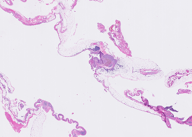 Representative H&E histological images of the pleurectomy specimen are shown in Figures 2 to 4 (1X and 20X magnification) and immunohistochemical stains for CD10 and estrogen receptor performed on the area of Figure 4 are presented in Figures 5 and 6, respectively. The diaphragmatic pedunculated polyp was composed of fibroadipose tissue with multifocal nodules with similar histological features as Figure 4 (not shown).